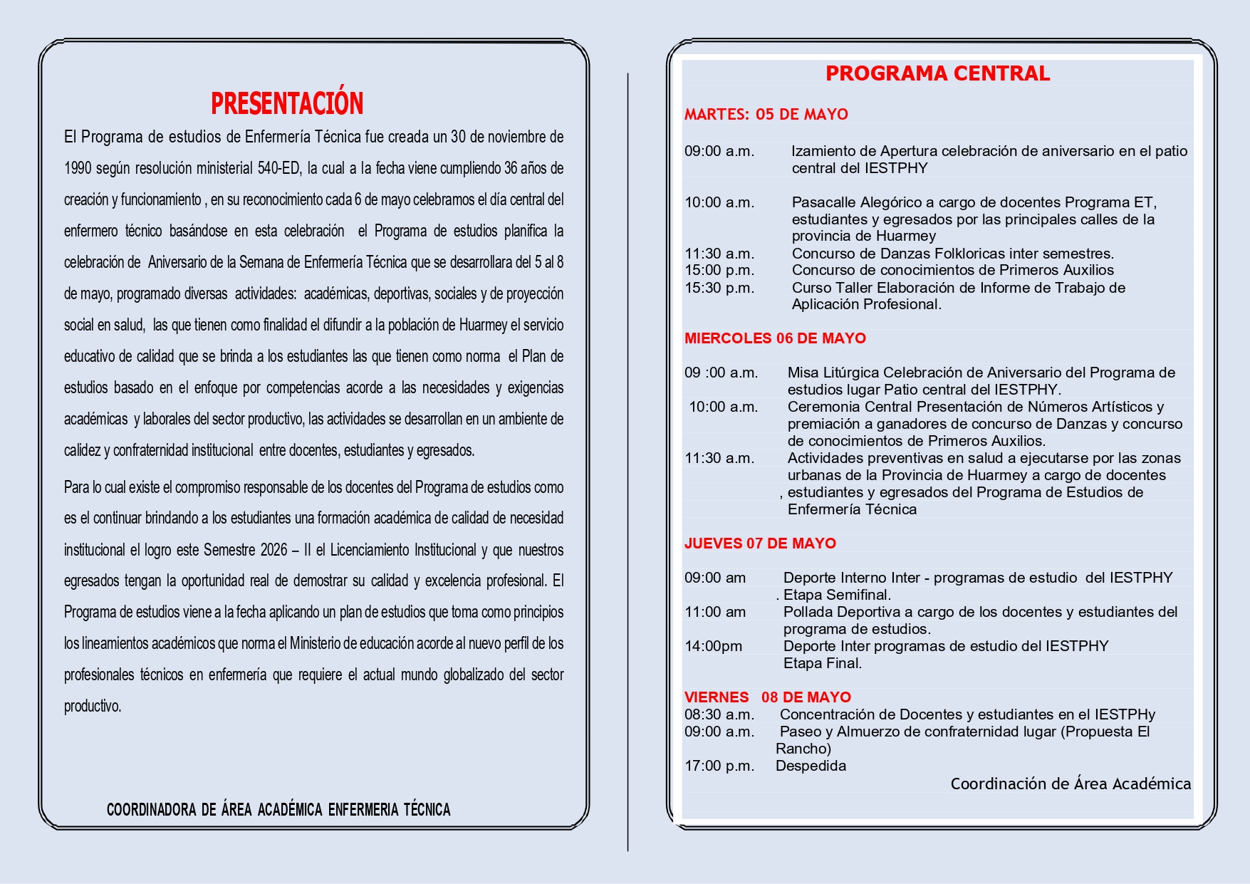 en su reconocimiento cada 6 de mayo celebramos el día central del enfermero técnico basándose en esta celebración el Programa de estudios planifica la celebración de Aniversario de la Semana de Enfermería Técnica que se desarrollara del 5 al 8 de mayo, programado diversas actividades: académicas, deportivas, sociales y de proyección social en salud