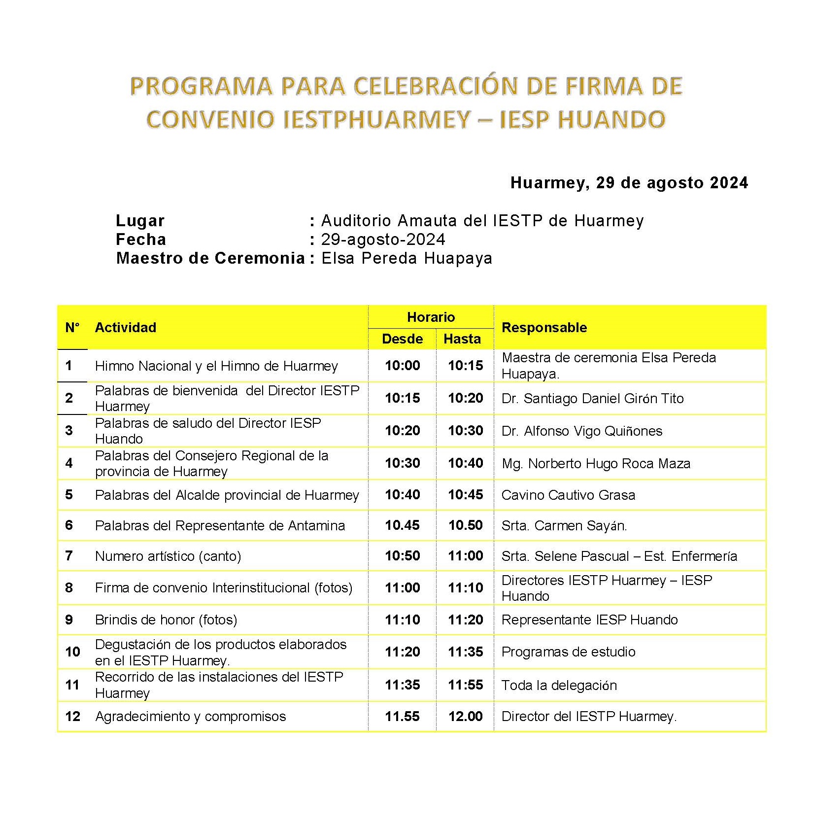 La Ceremonia de la Firma de Convenio se realizara en el Auditorio "AMAUTA" del Instituto de Educacion Superior Publico de Huarmey.
